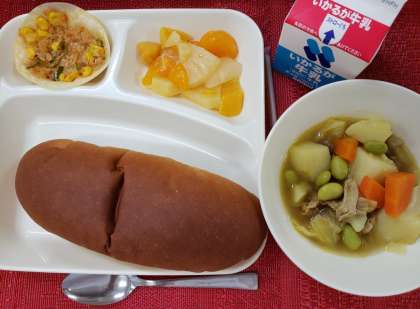今日のこんだては、パン、豚肉と野菜のカレースープ煮、変わりピザ、ミックスフルーツ(缶)、牛乳」です。