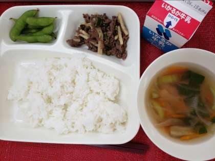 今日のこんだては、「ごはん、チンジャオニューロウスー、ハムと野菜の中華スープ、えだまめ、牛乳」です。