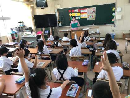 先生の話を聞いて、子どもたちはよく手を挙げていました。