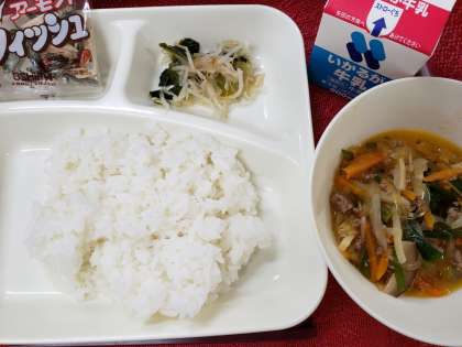 今日のこんだては、「ごはん、マーボーはるさめ、チンゲンサイともやしの甘酢あえ、アーモンドフィッシュ、牛乳」です。