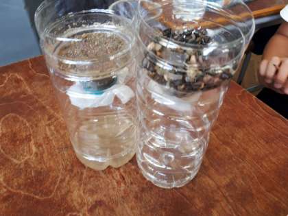 「土の種類と水のしみこみ方にはどんな関係があるのだろうか」ということを調べるために実験を行いました。