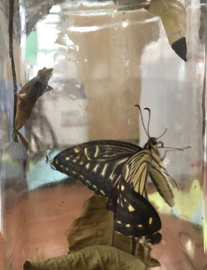 昨日の夕方に見たときはまださなぎのままだったのが、今朝、立派なアゲハチョウになっていました。上に写っている白くなったさなぎからチョウになったようです。
