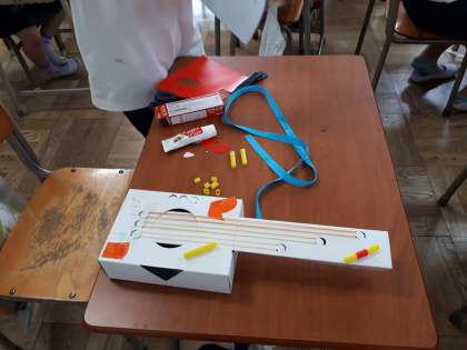 2年生は工作キットを使い、ギターやバイオリン、ウクレレなどの中から作りたい楽器を選んで組み立てていました。組み立てが終わった子どもはゴムで弦を作り、好きな模様を貼ったり描いたりしていました。