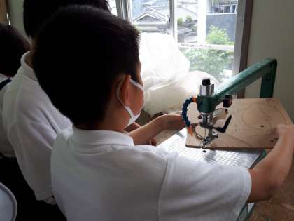 5年生は電動のこぎりを使ってパズルの制作に取り組んでいました。