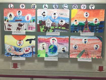 「しゃぼん玉にのって」という題名でそれぞれ空に浮かんで、下に見える世界を表しています。空をこのようにプカプカと浮いてみたいですね。