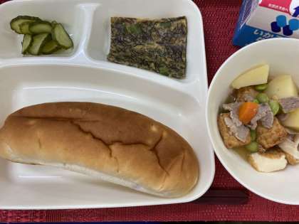 今日のこんだては、「パン、もずくいりヒラヤーチー、豚肉とあつあげの煮もの、あっさりきゅうり、牛乳」です。