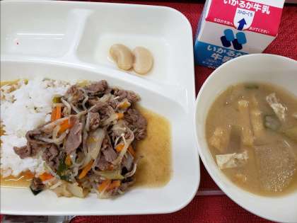 今日のこんだては、「牛丼、とうがんのみそ汁、白花豆の煮もの、牛乳」です。