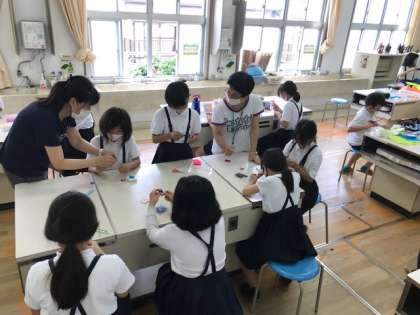 家庭科室での活動です。フェルトの生地を合わせてマスコットの製作やキャラクターを型取りしたものを使って小物づくりなどをしていました。