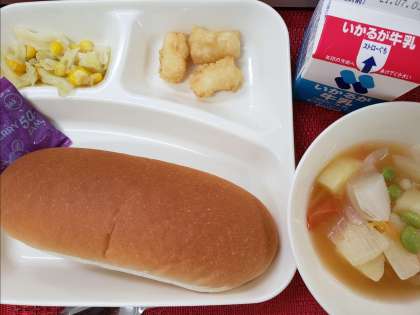 「いかてんぷら」は、冷凍のいかのてんぷらを給食室でさっくり揚げています。一口サイズで食べやすい大きさでした。おいしくいただきました。
