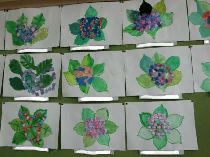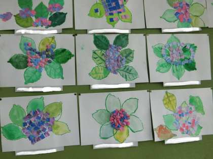 テレビ朝会で「つゆ」の話にアジサイについて取り上げたのですが、3年生の教室には後ろの掲示板にたくさんのアジサイの花の図工作品が飾ってありました。