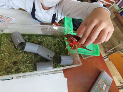 グループごとにザリガニの飼育箱からザリガニをつかんで机の上に置いて、ザリガニをつかむコツみたいなものを見つけていました。得意な子は何度もつかんでみせていました。