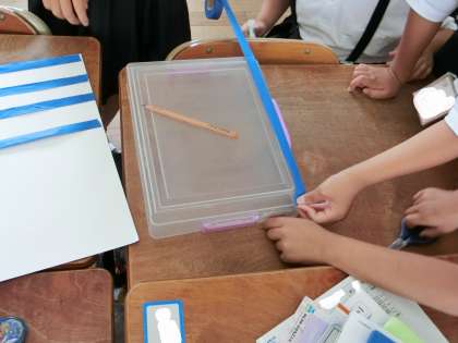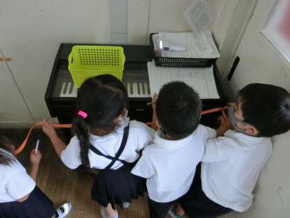 子どもたちが紙テープを使って、教室内にあるいろいろな物の長さを測っていました。