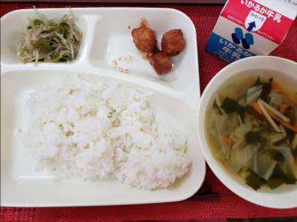 今日のこんだては、「ごはん、まぐろのオーロラ煮、すまし汁、もやしとピーマンのいためもの、牛乳」です。