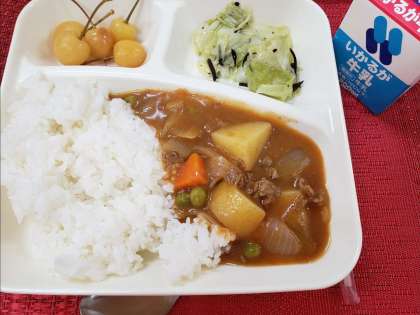 今日のこんだては、「ハヤシライス(米粉)、キャベツのひじきドレッシング、さくらんぼ(缶)、牛乳」です。