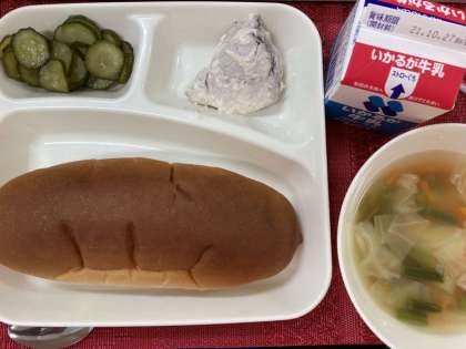 今日のこんだては、「パン、かつおのマリネ焼き(ノンエッグドレッシング)、鶏肉とじゃがいものスープ、きゅうりのサラダ、牛乳」です。