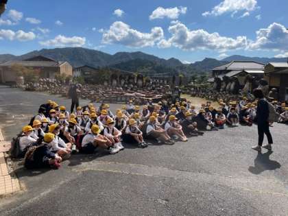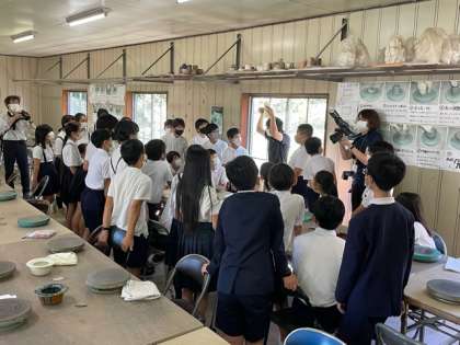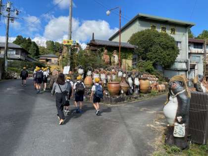 タヌキと一緒に学級写真を撮った後、陶器作りの説明を聞いています。