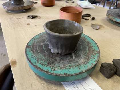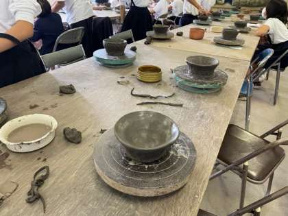 湯呑みやお茶碗など「○○を入れる○○」を作りました。最後は宗陶苑の方に仕上げていただき、登り窯で焼いた後、卒業式前に完成品が届きます。
