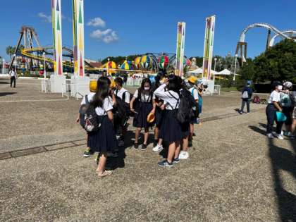 「次は何に乗ろうか」とスペイン村でグループ活動を楽しんでいます。
