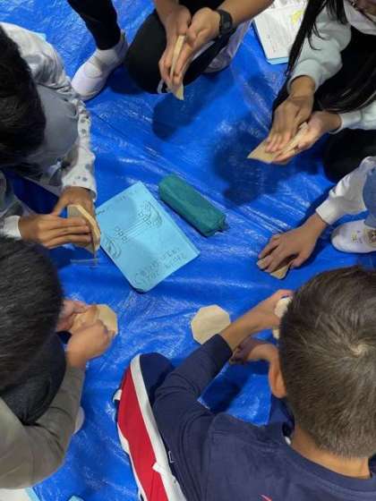 八角形の杉の板を、紙やすりでこすり、みんな思い思いのイラストを書いています。