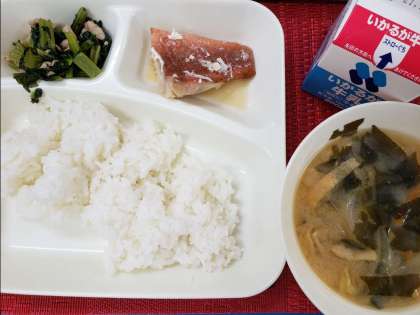 今日のこんだては、「ごはん、あかうのしょうゆだれかけ、みそ汁、こまつなのいためもの、牛乳」です。