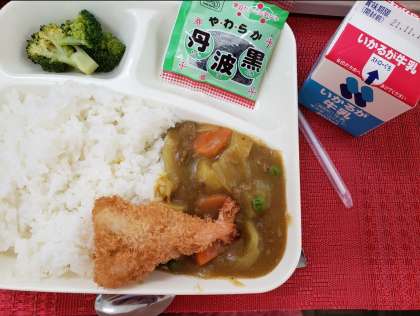 今日のこんだては、「えびフライカレーライス、ブロッコリーのサラダ、ソフト黒豆、牛乳」です。