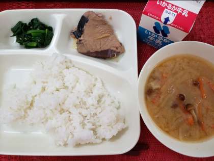 今日のこんだては、「ごはん、なまりぶしのしょうが煮、なめこのみそ汁、ほうれんそうのごまあえ、牛乳」です。