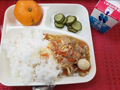 今日のこんだては、「中華丼、きゅうりの中華あえ、みかん、牛乳」です。