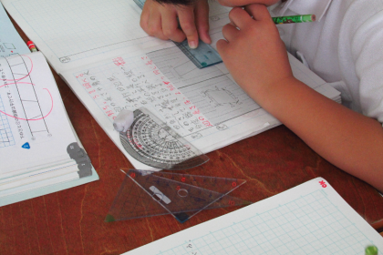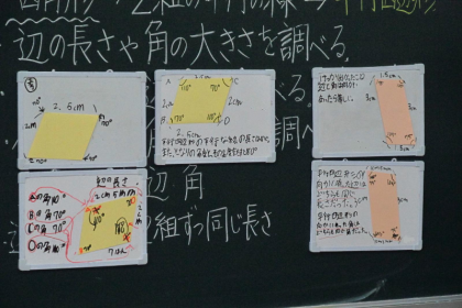 正方形や長方形の他に台形や平行四辺形という四角形があることも習いました。今日の学習では、平行四辺形の辺の長さと角の大きさを、コンパスや定規、分度器で測って、平行四辺形の性質を見つけていました。