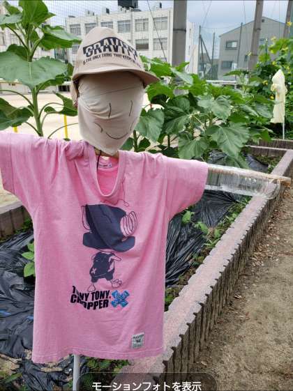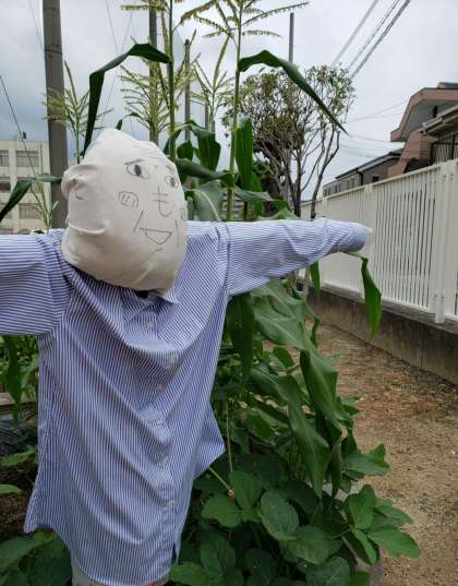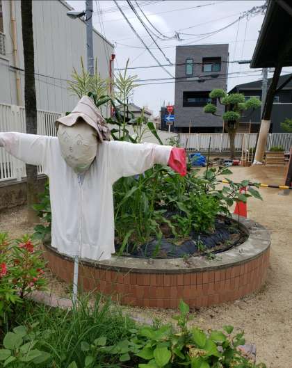 給食委員会活動で学習園に案山子をつくりました。ユニークな案山子ができあがり、「かわいいい!」「人がいる!」と話している児童もいました。学習園に植えてある植物を植物を見守っています。