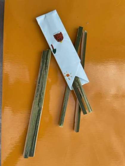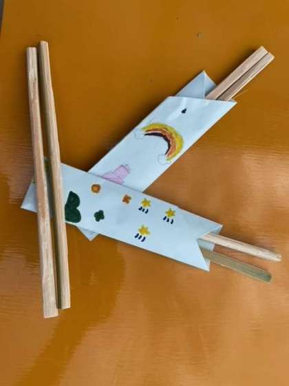 お箸が完成しました!細いのやら、太いのやら明日のバーベキューで使用します。さいばしではありません。マイばしです。学校で作った箸袋にいれて出来上がりです。