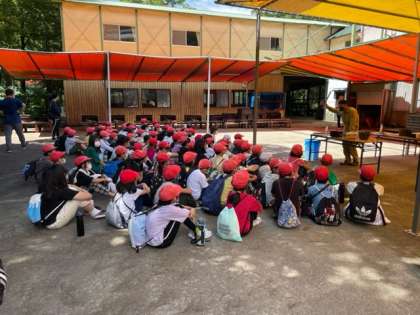 カレーライス作りの準備をしていただきました。かねいちやさんがとっても丁寧に説明して下さっています。みんな真剣な眼差しです。おいしいカレーができますように!