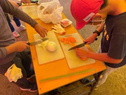 ご飯の係がかまどで火の番をしている間に、野菜係がじゃがいも、にんじん、玉ねぎを切っています。普段のカレーよりも細かく、薄く切ることがコツです。