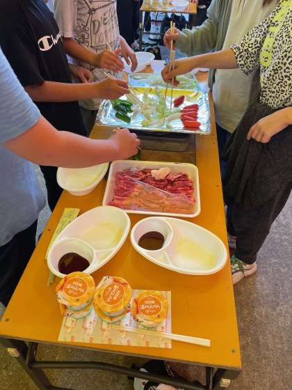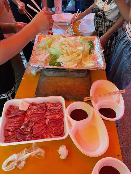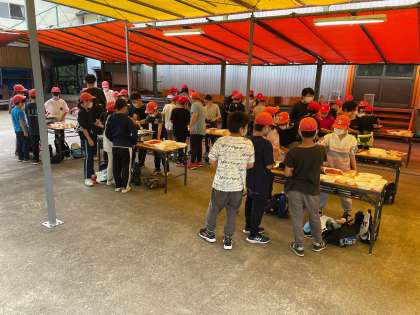 活動班ごとにお食事です。まずは野菜を焼いてから、お肉です。ワイワイ楽しみながらいただきます。