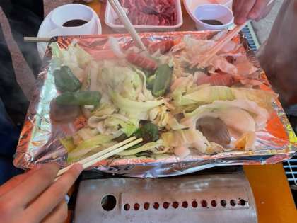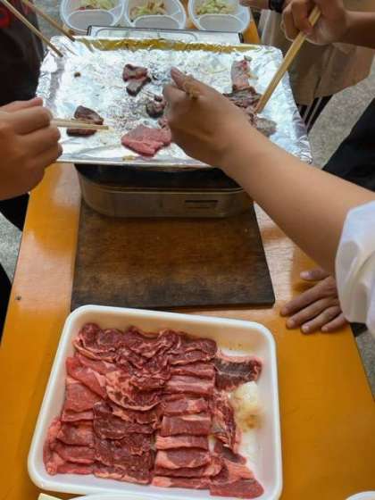 ?先に焼いた野菜を取り分けてからいよいよお肉の投入です。