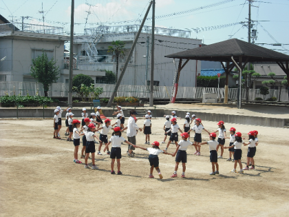 今日は運動場を使って、大きい一つの円形から、6個の小さい円形に移動する練習をしました。その後、体育館でも繰り返し練習をがんばりました。