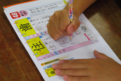 3年生の教室では、漢字の学習をしていました。先生のお手本に合わせて書き順を確かめた後、ドリルで練習しました。薄文字をていねいになぞってからきれいに書いていました。