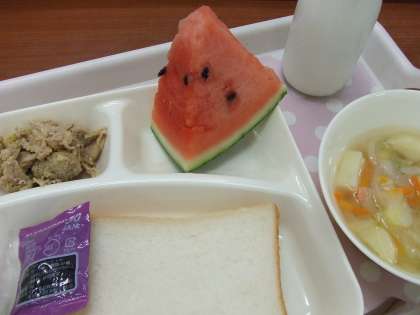 「豚肉のカレー風味焼き、じゃがいものスープ、すいか、食パン、ブルーベリージャム、牛乳」です。