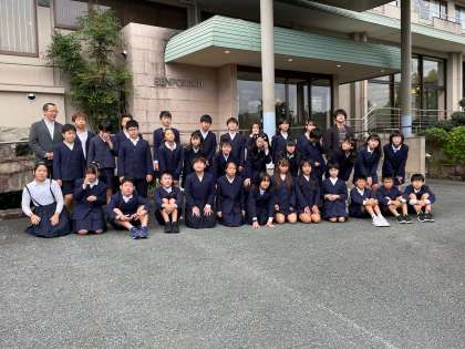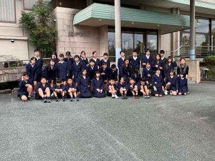 スペイン村への出発前に宿舎前で学級写真をパチリ。