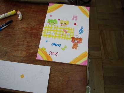 今日、3年生は、くぎうちトントンの絵を板に描いた後、絵の具で色塗りをしていました。