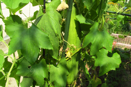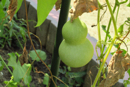大きなヘチマやヒョウタンの実ができていました。ヒマワリは高く伸びて、2メートルほどもありそうです。