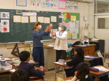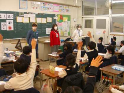 ゲストティーチャー3人の方々(NPO法人えんぱわめんと堺)が3年生の子どもたちの前で、休み時間の出来事を実演し、子どもたちは、自分の経験をもとにどうすればいいか意見を発表しました。
