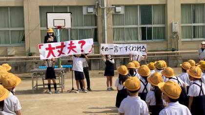 今日は初めに、計画委員会から今年度のいじめをなくすスローガンの発表がありました。