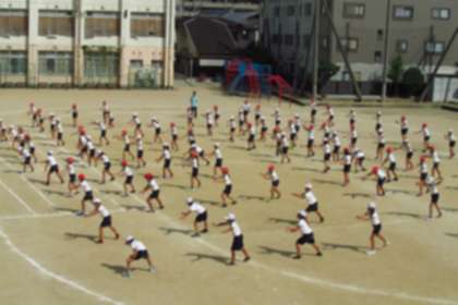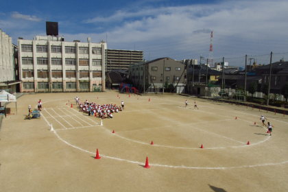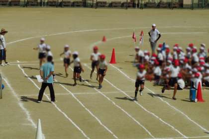 5年生は男女混合のチームで走り、全体で3回戦します。一人1周走ります。3つめのコーナーを通過した順番に、次の走者がインコースに入れるコーナートップ制です。