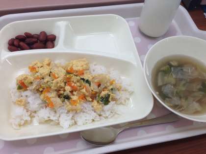 「親子丼、すまし汁、金時豆の煮もの、牛乳」です。