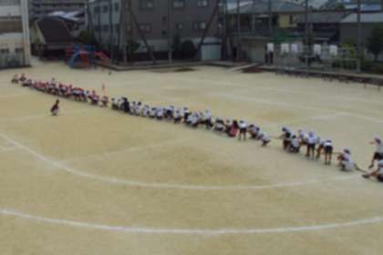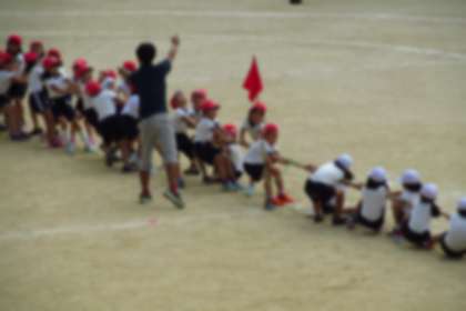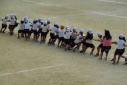 3年生の児童たちの手には太い綱を握って、赤白交互に引き合います。相手の引っ張りに引きずられないように、腰を低く落として踏ん張っていました。