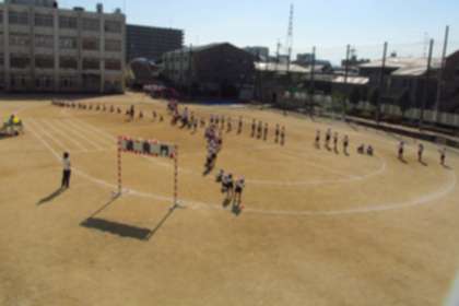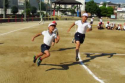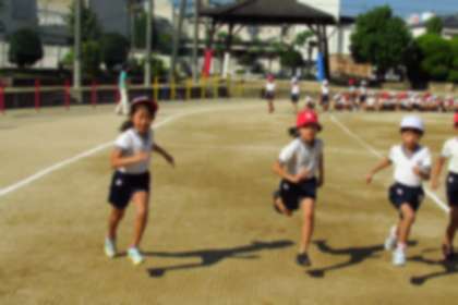 3年生が運動場でかけっこの練習をしていました。4人ずつ走ります。スタートしてから最初のコーナーまでの直線部分はコース通りまっすぐに走ります。コーナーの所からフリーになるので、うまくインコースがとれるかどうかがポイントです。