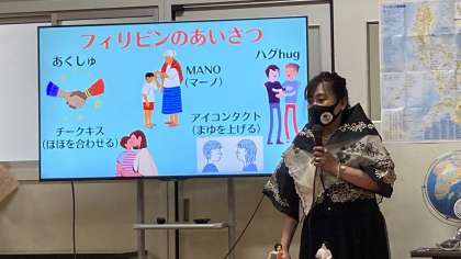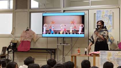 フィリピンの小学校で習うことや挨拶などの簡単な言葉を紹介いただき、最後には、代表の児童や先生が衣装を着る体験をしました。