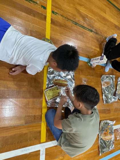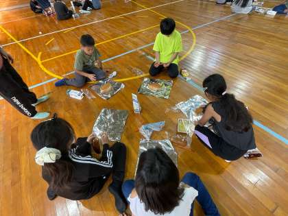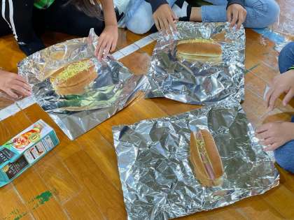 自分たちでパンにキャベツとウィンナーを挟んでアルミホイルで包み、牛乳パックに入れます。