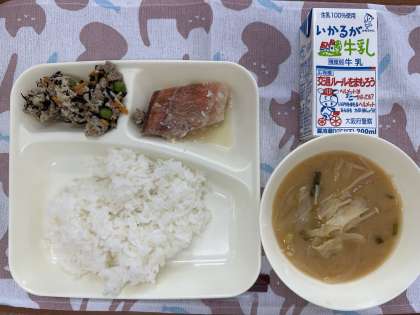 今日のいり煮には、粉末にした高野どうふの他に、豚ひき肉や、にんじん、ひじき、グリーンピースも入っています。