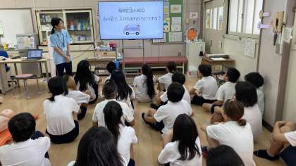 「AEDはうちのマンションの下にあるよ」や、「自分にできないことは近くの大人に伝えて助けてもらう」等、子どもたちも意見を言いながらしっかりお話を聞いていました。さすが6年生です。